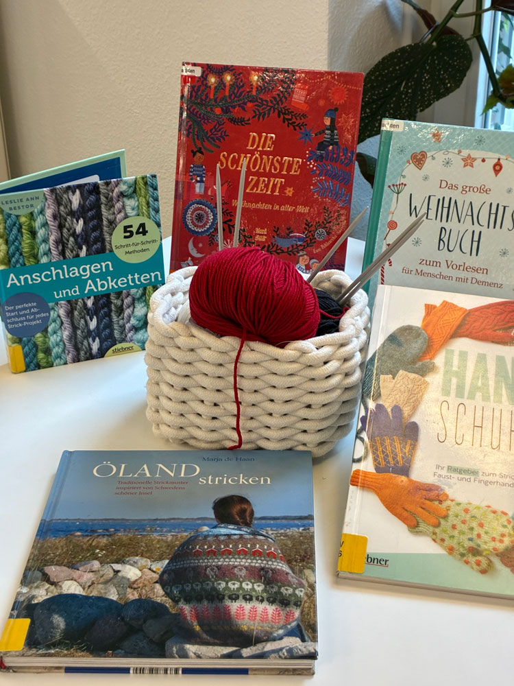 Gemeinsam Stricken, Häkeln und (Vor-) Lesen. Eine Person liest vor und wer möchte, strickt und häkelt dabei.